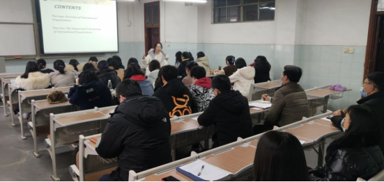 今天的开学第一课是由王一玲老师为国际事务与国际关系(中外合作办学)专业2001班讲述的《国际组织概论》。上课前同学们都提前到齐,佩戴好了口罩,展现了同学们良好的防控意识。老师全程全英文教学,为同学们介绍了世界各国际组织的基本理论知识,提出了课程目标与要求,同学们注意力高度集中,课堂气氛轻松活跃。