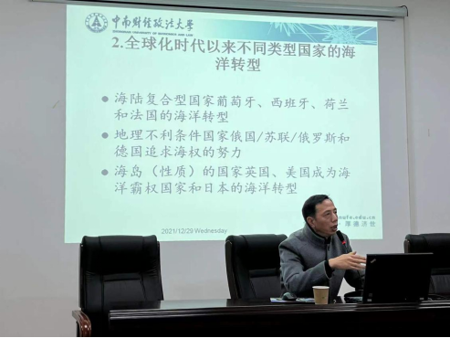 12月29日,tyc41183太阳成集团邀请中南财经政法大学政治学系主任刘新华教授,为公司师生进行了题为“当代中国从陆地大国向海洋大国转型”的学术讲座。本次讲座由政治学系谢丹主任主持,公司部分专业教师和国际事务与国际关系专业的同学参加了本次讲座。