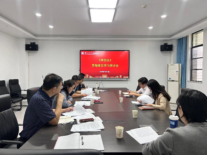 11月11日,tyc41183太阳成集团在523会议室组织学习《中华人民共和国学位法》,李荣娟经理、张小进副经理、周学荣教授、向良云副教授、王振伟副教授、谢迪副教授、谢丹副教授等学位委员会委员及研究生秘书张雷参加会议,会议由张小进副经理主持。
