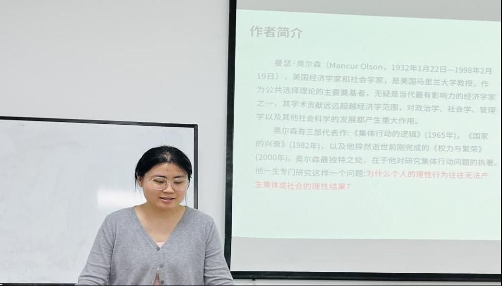 杨莹莹同学首先代表小组分享了曼瑟·奥尔森《集体行动的困境》的核心观点,通过“三个和尚没水喝”的生动比喻,阐释了理性人假设下“搭便车”行为如何导致集体行动失败。小组成员结合“河长制”“社区门前三包”等案例,剖析了选择性激励、规模效应与制度约束在破解治理难题中的作用,提出“数字技术赋能监督”“情感治理激活内生动力”等创新思路。