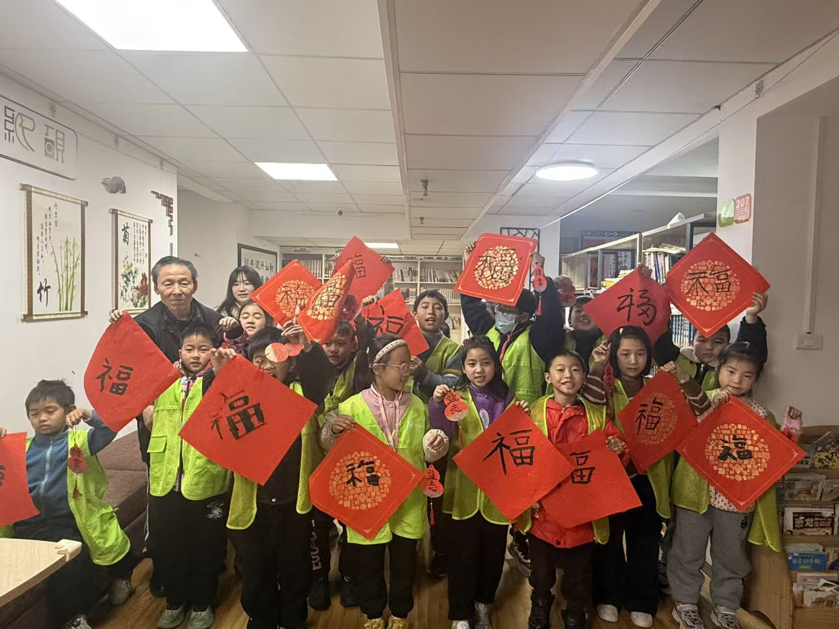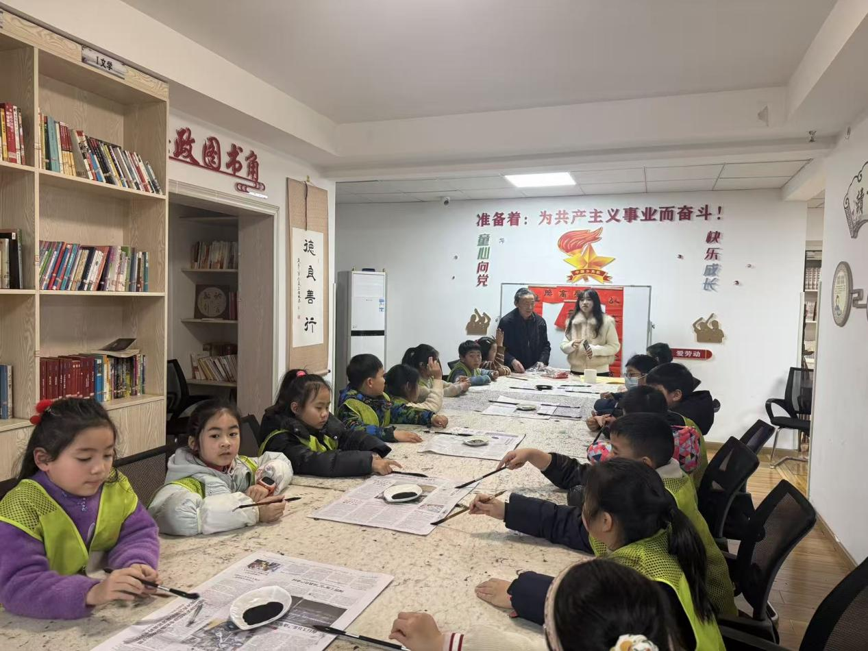 书法实践环节是活动核心亮点,石维林老党员现场示范软笔握笔、运笔技法,细致讲解福字、红色标语的书写要点与情感融入方法,以扎实功底传递书法之美与传承之道。现场更形成“少先队员学榜样、共青团员传精神、老党员育新人”的身份递进格局,三代人默契互动、薪火相传:老党员挥毫泼墨,笔力遒劲尽显初心;团员们认真临摹,还主动帮扶孩子们纠正握笔姿势、分享技巧;孩子们一笔一画练习,在笔墨中感悟红色文化魅力。石老全程巡回指导、耐心纠错,现场墨香四溢、氛围浓厚。活动选取优秀作品集中展示,石老逐一点评,引导大家将红色精神与文化自信融入笔端,实现传统文化与红色基因同频共振。