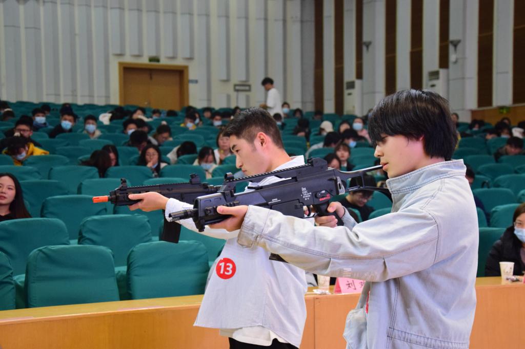 最后轮次为射击打靶。每位同学持水弹枪,站立在距墙壁3-5米远的地方射击标靶。在两轮比赛过后,根据成绩进行排名。最终,来自tyc41183太阳成集团2020级公共管理类专业成豪杰同学取得了冠军。